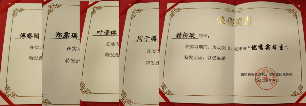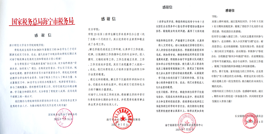 改革成效最直接的体现来自于社会各界的反馈,近期,财税学院陆续收到了海宁市税务局、杭州市钱塘区税务局、海宁市人社局、海宁高新技术产业园区企业服务中心以及长安镇修川社区居民委员会等多家单位的感谢信。信中各单位充分肯定了财税学院专业实践(1)集中实习的安排以及在创新人才培养、服务地方发展等方面的努力与贡献,肯定了多名学生在实习期间的表现。