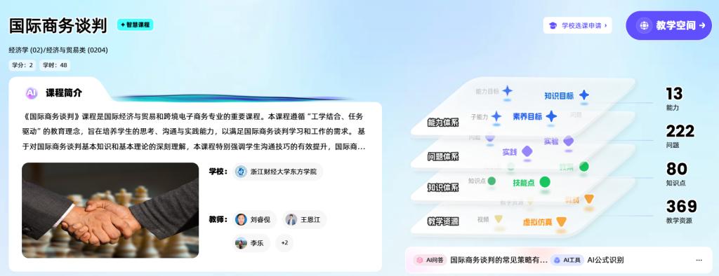 会上,王老师以《国际商务谈判》《进出口报关》等14门课程为案例,系统讲解四大模块应用路径:课前利用“AI创作教案”生成图文并茂课件;课中通过“AI随堂测验”推送习题并自动生成学情数据,优化互动模式;课后依托“AI学情洞察”分析数据,生成“个人知识雷达图”并推送薄弱点资料;同时支持搭建“企业管理者”等虚拟角色智能体,助力学生模拟训练以提升实践能力。